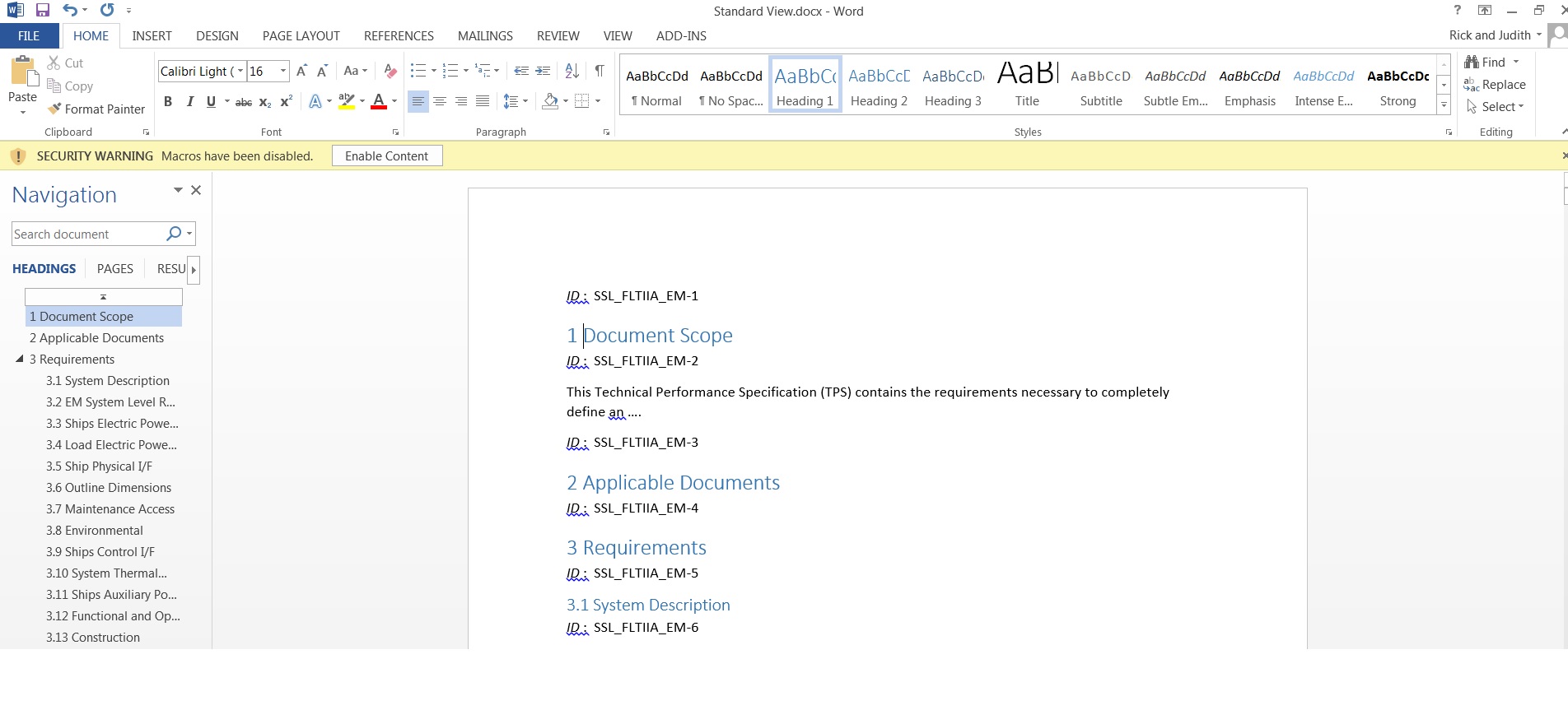 Thanks for the reply to my question. I read your answer but I still have the same problem. I have the 'Paragraph Style' Option checked when I run the Microsoft Word Export script (File > Export > Microsoft Export > Word) but the output behavior changes when I use different DOORS views. In the first view "Standard" , I only have one column. This column is in the Standard View and only contains the "Object Heading and Object Text" when you look under edit properties. After I export to Word, I get the correct Paragraph Styles which match the Attribute 'Paragraph Style' in the module." This is shown in the attached file - Standard View.jpg In the second view "Word Output" , I again only have one column. But this time the column is a DXL attribute which has 4 attributes combined, as I mentioned in my first post. I also added the square brackets around the Object Identifier and the Type attributes. I was able to add these brackets by modifying the DXL attribute (see the attached file Group Text.dxl) Here are the 4 attributes: [Object Identifier] Object Heading Object Text [Type]. When I export these to Word, I get each paragraph in the "Normal" Style. There are no Heading 1 or Heading 2 Styles on the Object Heading. Is it possible that I need to include some DXL code in the DXL attribute to be able to get the Word export to use the correct Paragraph Styles when I use a DXL attribute? When I am done exporting to Word, at a minimum I need to go through the Word document to change the Paragraph Style of the Heading to create a Table of Contents. By creating the DXL attribute, I am adding a lot of value to the Specification, but if would save me time if I could get the Paragraph Styles to work. Thanks! -Rick Attachments Group Text.jpg Group Text.dxl Standard View.jpg |