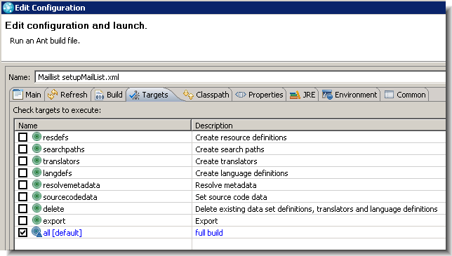 - Run the setupMailList.xml Ant script by right-clicking the script from the Navigator view, then selecting Run as -> Ant Build …. From the JRE tab, make sure you select the run in the same JRE as the workspace option. On the Targets tab, notice the various targets provided in the setupMailList.xml script. All is the default target. To run the script again, you might choose to build the delete and all targets, in that order.