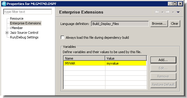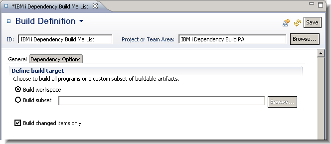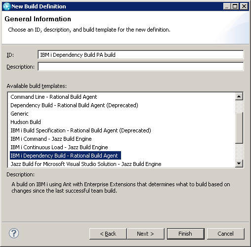 The other IBM i incremental build template, IBM i Build Specification – Rational Build Agent, is still available, but it is now marked as deprecated. The new IBM i Dependency Build template offers large performance gains when performing incremental builds; as it caches traces of the build results to determine what to build, without having to perform timestamp comparisons with each of the built objects.
