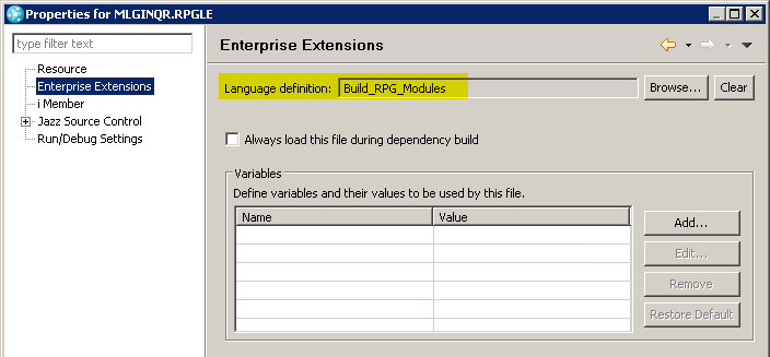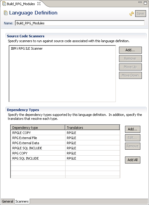 - Language Definitions contain dependency build information such as the list of translators (described later) used in building an SCM resource. As shown in the following figure, the setup script instructs the Build_RPG_Modules language definition editor to use only the RPGLE translator.