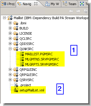 - In addition to the IBM i resources that are part of the sample mailing list application, the Maillist project also contains several resources you can use to configure a dependency build. Expand the Maillist project from the Navigator view and the following resources are displayed: