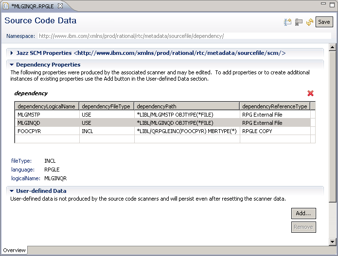 The Dependency Properties section shows the dependencies for the selected member. Notice also the section titled User-defined Data. Any additions made here are persisted even when the streams are scanned again. This is also where you can modify manual dependencies. You should manually indicate dependencies when there are no scanners applicable to the resource, or when the scanners are unable to determine a dependency by scanning the source file.