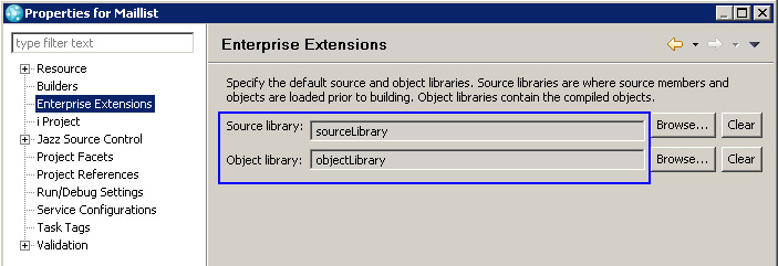 - The Libraries node contains existing and target library definitions, which you can use to create search paths. Existing Library Definitions consist of full library names that you can use to introduce common libraries required at build time. The sample mailing list application does not make use of existing library definitions. Target Library Definitions are used to specify load and output libraries and consist of a suffix to be appended to the resource prefix specified in build definitions. The mailing list application specifies two target libraries: the sourceLibrary (“_L”) and the objectLibrary (“_O”). You can also reference these definitions from i project properties. The mailing list application configures the i project with source and object libraries, as illustrated by the following screen capture: