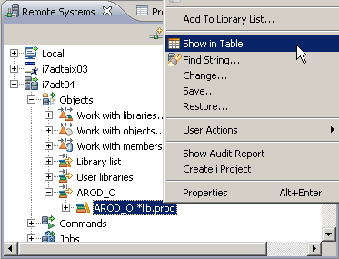 - Switch to the Remote Systems Explorer perspective. Find your output library in the Remote Systems view, right-click it, and select Show in Table.