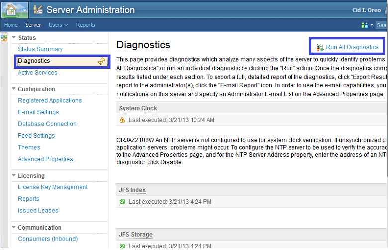 The diagnostics are capable of analyzing many aspects of the CLM application to quickly identify problems. Ensure all diagnostics complete successfully.