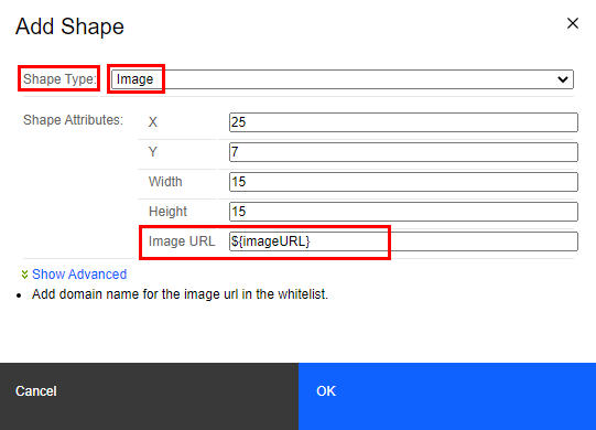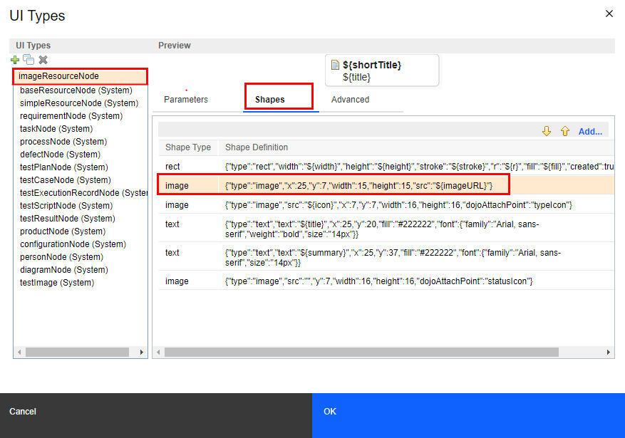 When you tried to enter a parameter value for the Image URL attribute, an error was shown. Now, you can add a parameter value for the Image URL attribute. You can add an image parameter to the UI type and enter value such as ${imageURL}. Note: The name of the image parameter in UI type must match with the variable name in the query result. When a container is loaded on the view canvas, the image parameter value from the query result is used to load the image in the resource node. To use an image in IBM Engineering Lifecycle Optimization - Engineering Insights (ENI), you must add domain of the image URL in the whitelist. For more information, see Managing the whitelist for uploading images. If domain of the image URL is not added in the whitelist, the image is not displayed when the container is loaded on the view canvas. Image of image parameter that is added in the UI type definition: ![]() The image that is defined on the Shapes tab is loaded based on the shape and visible for each resource node when the container is loaded on the view canvas. Important: To view the defined image when a container is loaded, you must add or update an image as a shape in the UI type definition. For example, you can either add an image and enter value for Image URL parameter as ${imageURL} or update the existing image's Image URL parameter as ${imageURL}. Image of adding Image as Shape Type: ![]() Image of defined image parameter on the Shapes tab: ![]() Image of container that is loaded with the defined image: