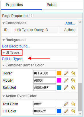 Image of the new Rename icon: ![]() Image of Rename UI Type ID window: ![]() Image of Rename UI Type ID window with new name: ![]() You can also rename a UI type by using the UI Types option in the Properties section of the view. Click Edit UI Types. The UI Types dialog box opens. Image of UI Types option in the Properties section of view: ![]() |