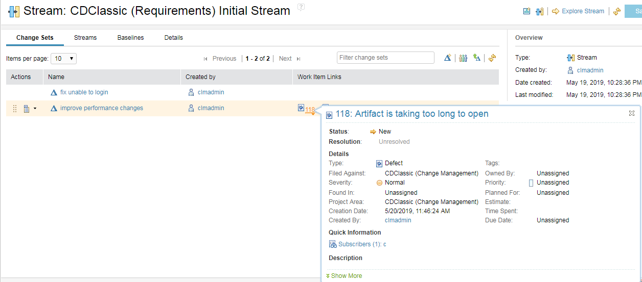 You can view work items linked to change sets in a stream In the context of a stream, you can now view the work items linked to change sets. Previously, you had to open each change set to find the work item links. Image of the work items linked to a change set in a stream: ![]() To see more information about the work item, hover over the link. Image of the work item details when you hover over the link: