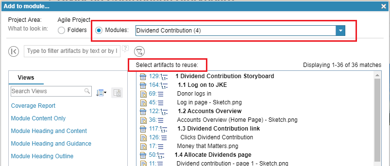 You can insert an existing artifact from another module When inserting an existing artifact into a module, you can now choose the artifact from another module. The artifact will be reused in the module you add it to. This action is similar to copying and pasting artifacts between modules because the base artifact is what is added to the module.
