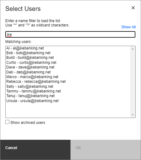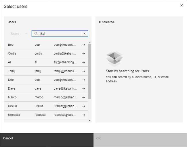 A new people picker component is now introduced as part of the ongoing user experience transformation and alignment with IBM's open source Carbon Design System. The people picker is a dialog box for selecting users and can be used for assigning an owner or a set of subscribers to an artifact. The new people picker is common across the following applications: