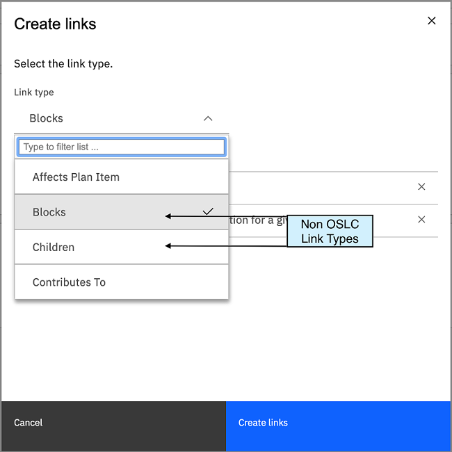 Support for non-OSLC link types You can drag a work item from the work item editor, plan editor, or quick planner views and drop it on the work item editor to create non-OSLC links such as parent-child and depends-blocks.