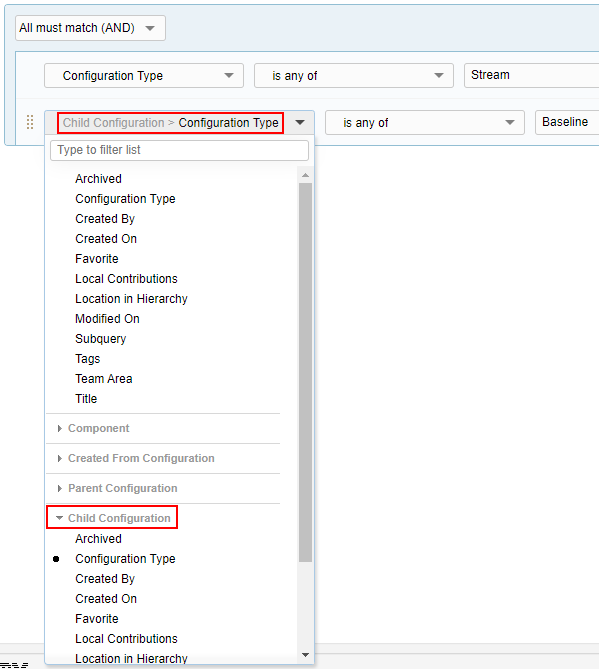 Configuration Type is any of [Stream] AND Child Configuration > Configuration Type is any of [Baseline] Here, the query matches all global streams that have global baselines as direct child contributions. The results are always parent global configurations; the matching children are just a part of the query qualifications. Also, these conditions query against child global configurations only, and not local configurations from other applications. Image of query conditions for child configurations: ![]() |