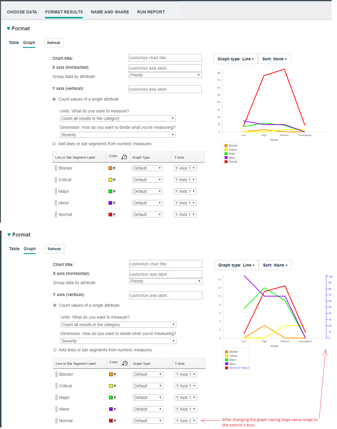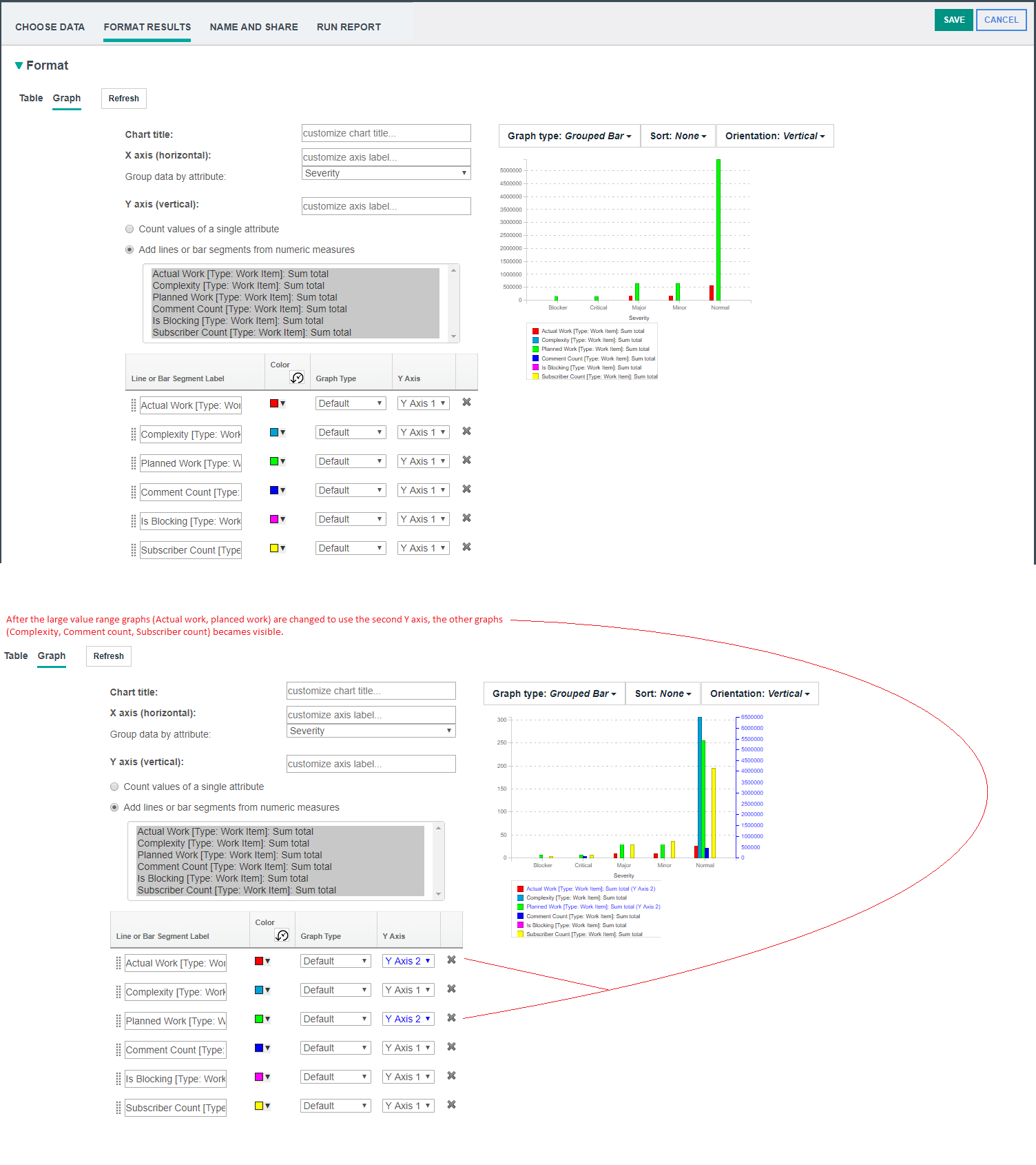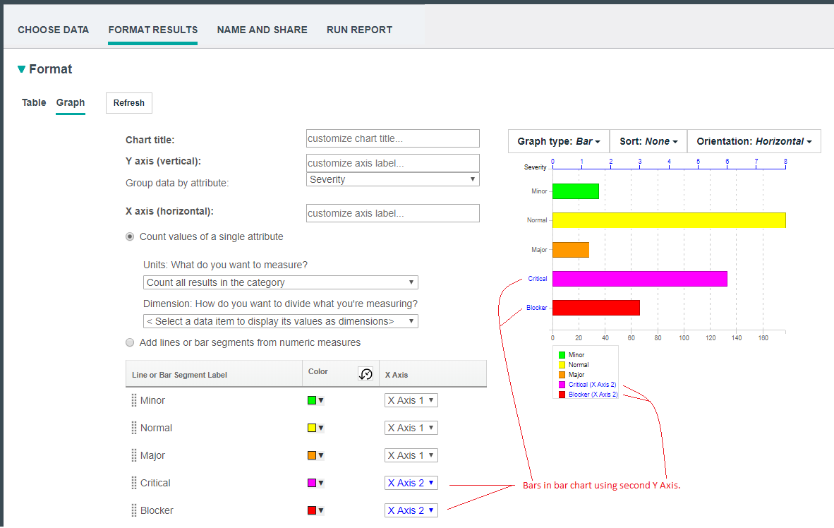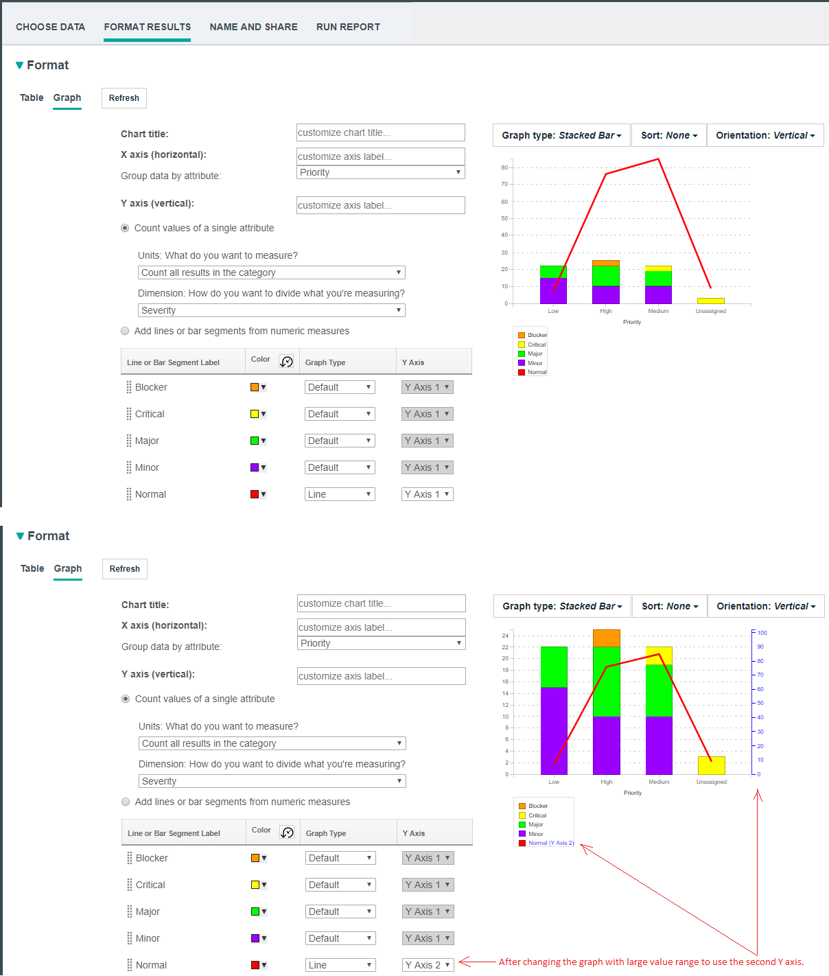 Multiple Y axes within a chart for easier viewing When viewing bar or line graphs that have very different value ranges, the graph with the smaller value range is drawn like a straight line closest to the X axis. Sometimes it can be hard to see the trend and variation of the line graph. To enhance the visualization in these cases, you can now use a second Y axis with a different scale for most of the existing charts (except the pie chart). Try the second Y axis to magnify the graph items with the smaller value range. Alternatively, you can move the group of graphs with the larger value range to the second Y scale and leave the graphs with the smaller value range using the standard Y axis. When the chart orientation is vertical, the second Y axis is located on the right side of the chart. When the chart orientation is horizontal, the second Y axis is located at the top. The graph items that use the second Y axis are shown with a different color in the legend, in the value string of the tooltip of the bar and line graph, and the bar label in the bar chart. Image of a bar chart with a second Y axis: ![]() Image of a line chart with a second Y axis: ![]() Image of a stacked bar chart with a second Y axis: ![]() Image of a bar chart with a second Y axis: ![]() |