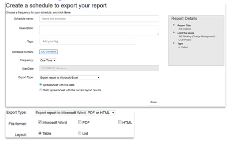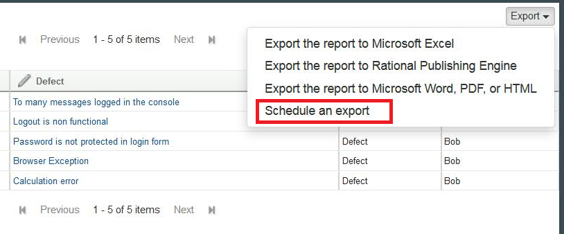 To schedule a report, click Export > Schedule an export. |
