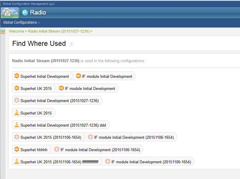 The GCM UI provides a finduse capability. Users can select a configuration and use the Find Where Used action